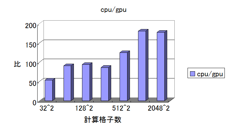 512^2と2048^2の間にある1024^2の計算格子領域で一番GPU/CPU比が高く181倍も高速化ができた。